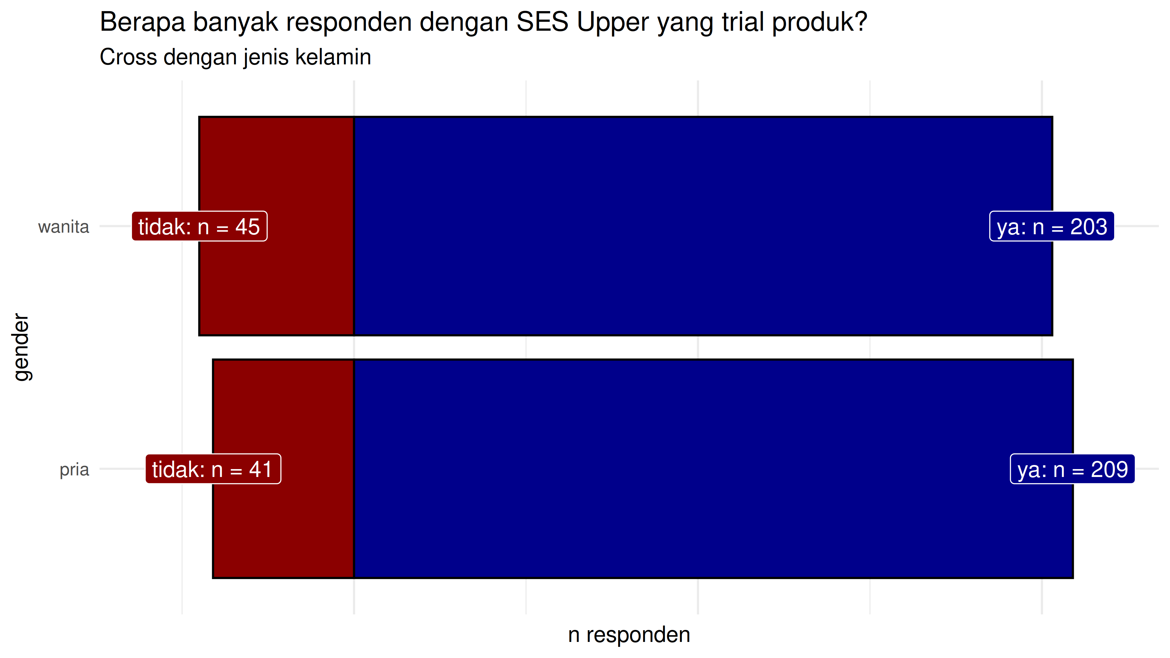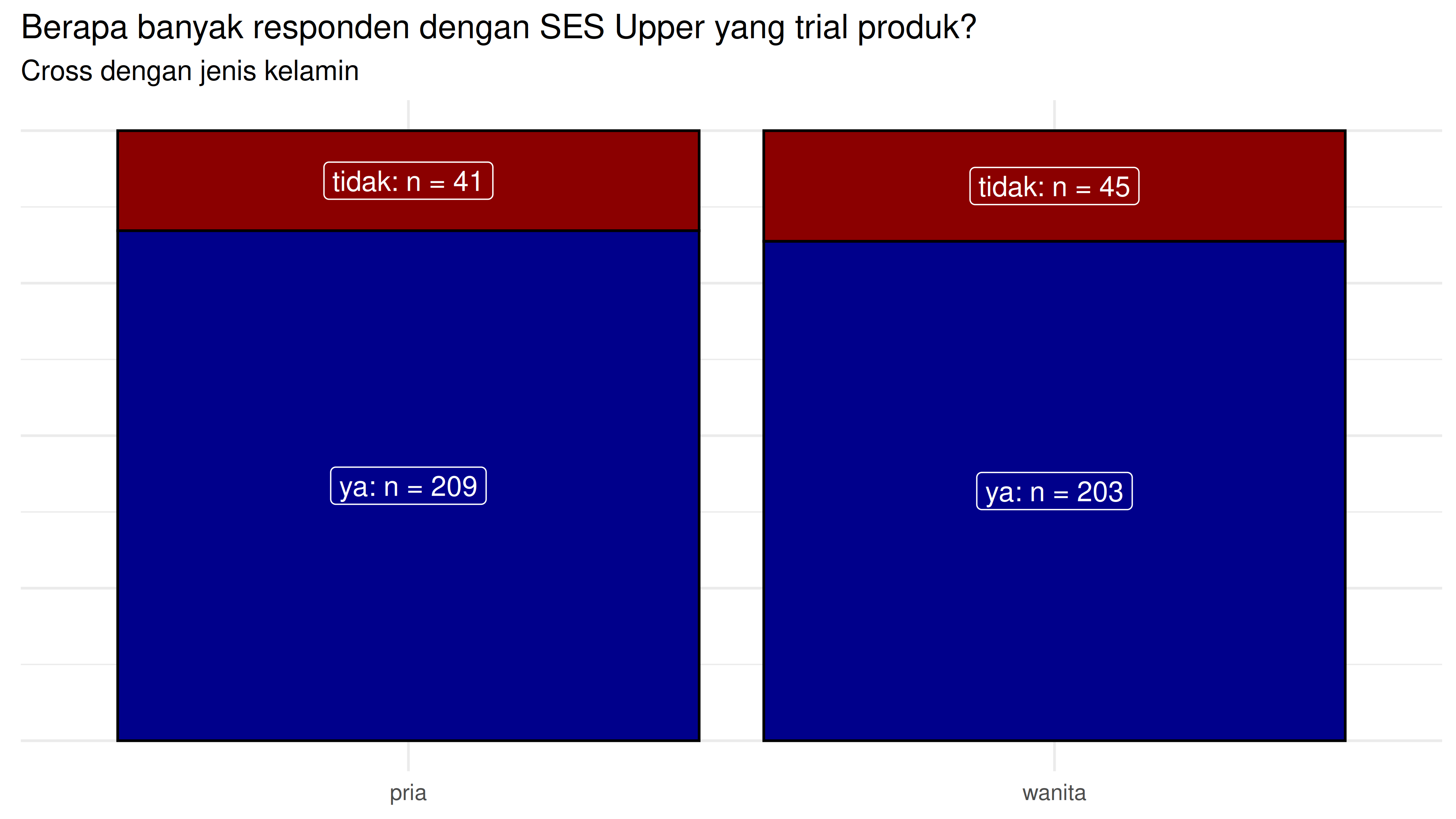 Berapa banyak responden dengan SES Upper yang trial produk? Coba cross per jenis kelamin!