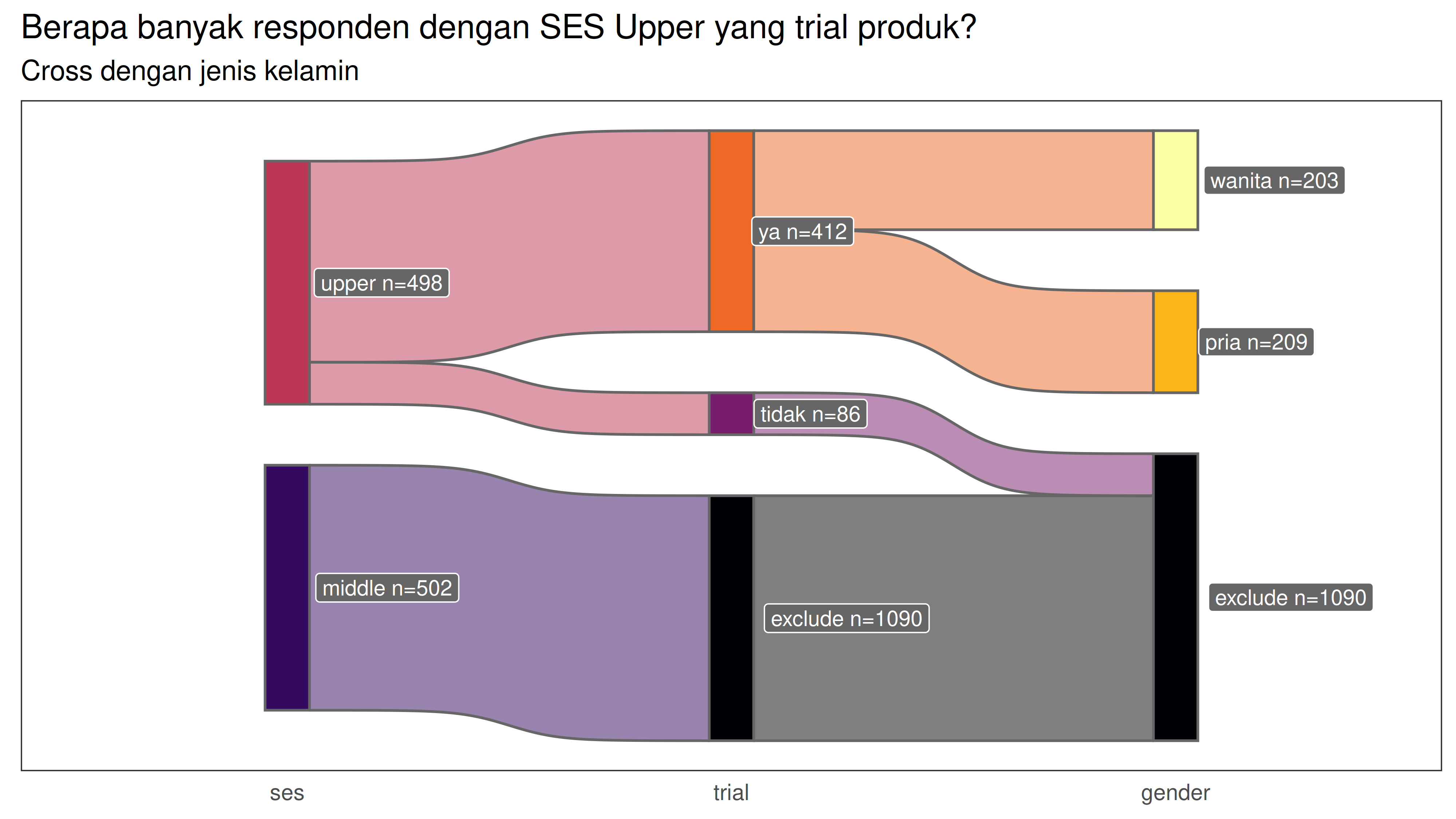 labs(title = "Berapa banyak responden dengan SES Upper yang trial produk?",subtitle = "Cross dengan jenis kelamin",fill = 'Nodes')