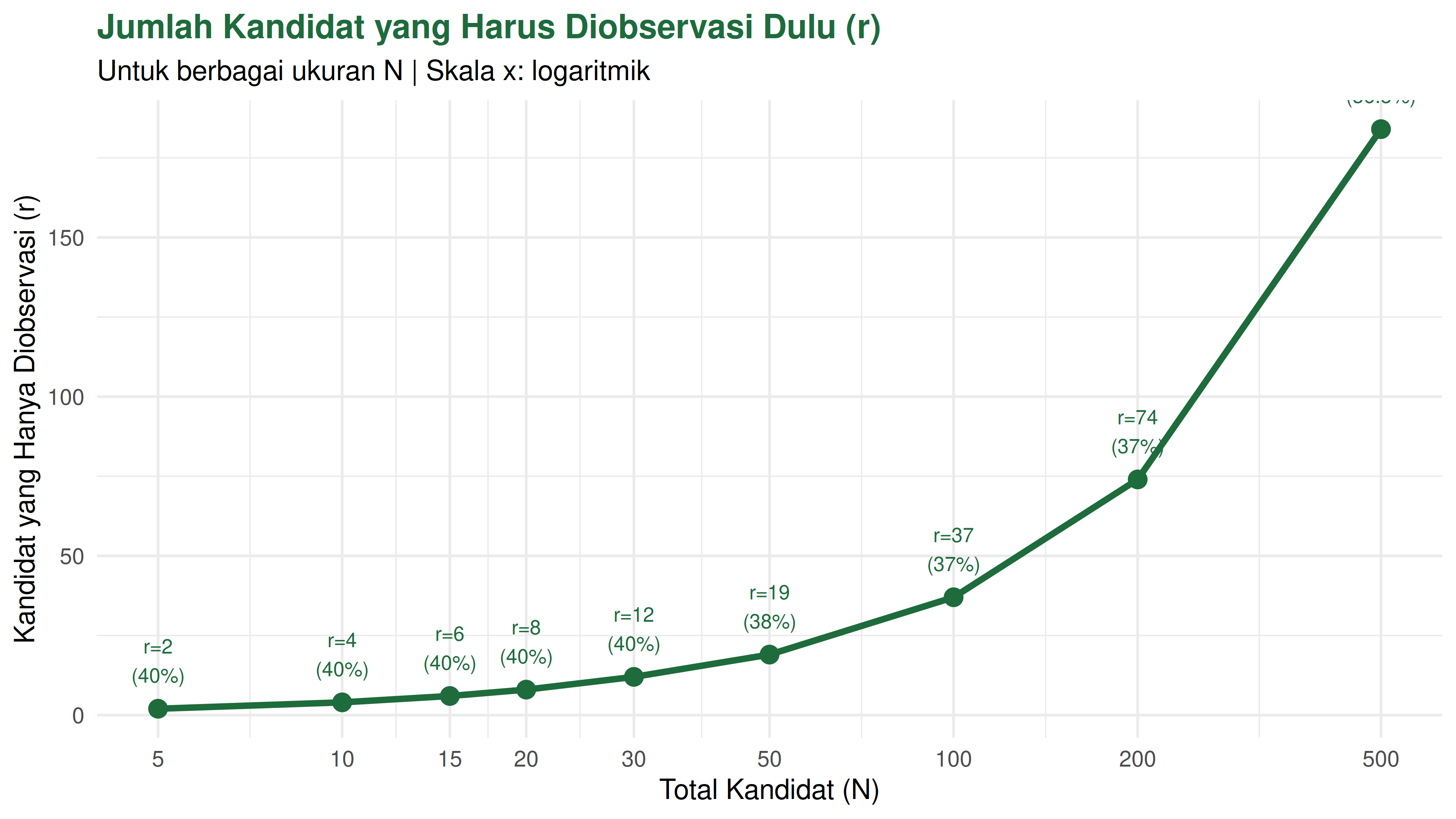- Ketika biaya observasi tinggi. Kalau setiap wawancara butuh 3 jam persiapan, ‘buang’ 37% kandidat hanya untuk observasi bisa sangat mahal. Dalam kasus ini, r optimal mungkin lebih kecil dari 37%.