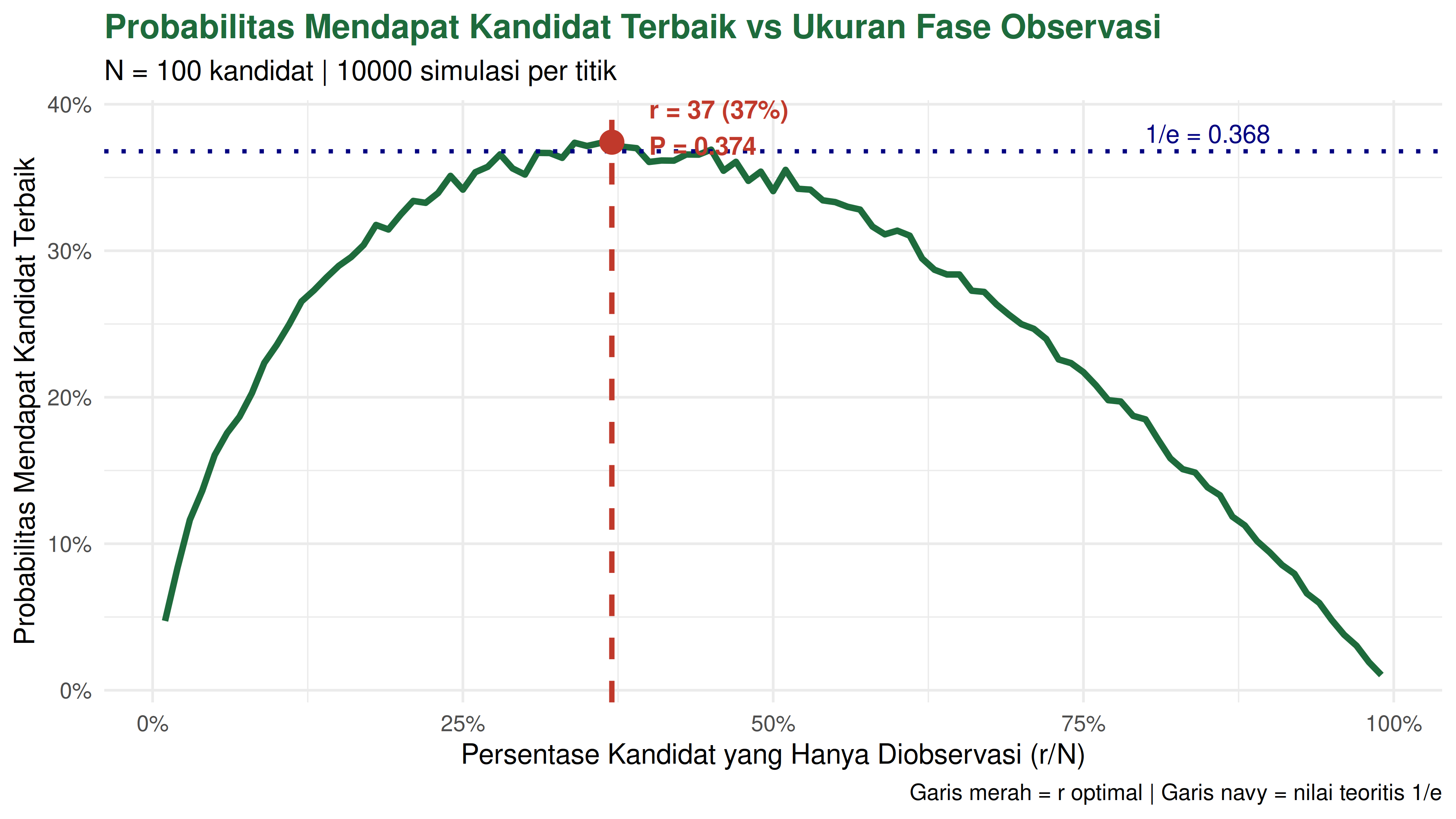 Hal yang menarik adalah matematika menunjukkan bahwa trade-off ini punya titik optimal yang secara mengejutkan konsisten di berbagai ukuran N. Yakni selalu sekitar 37% pertama hanya untuk mengamati, lalu bertindak.