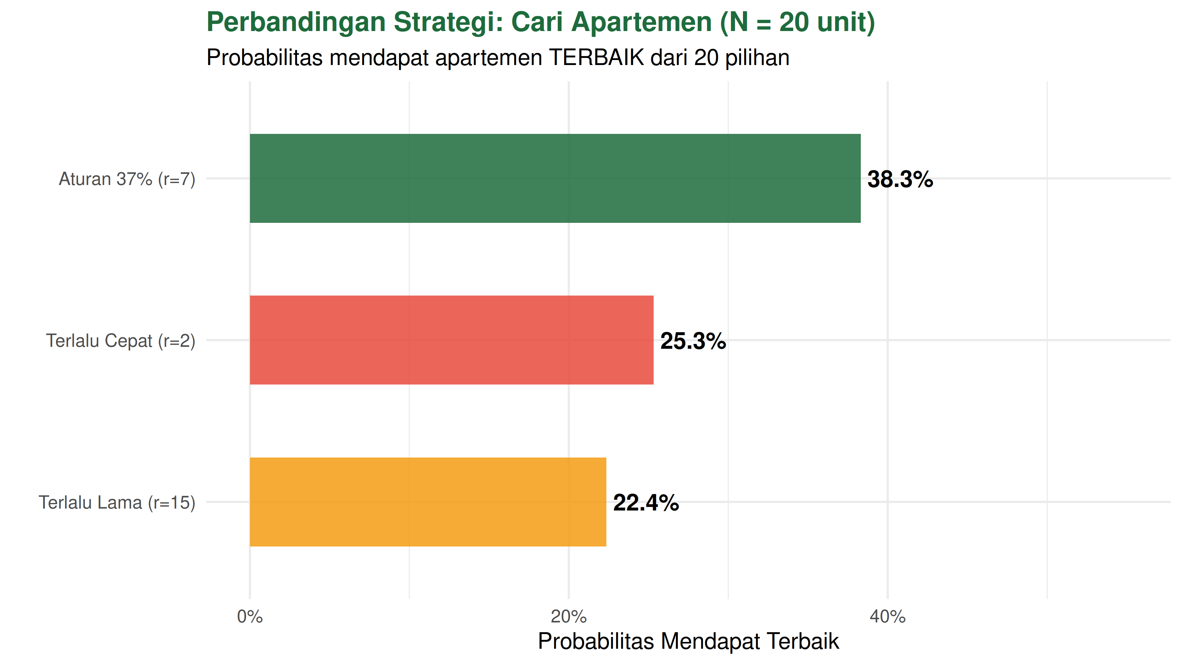 strategi = c('Aturan 37% (r=6)', 'Terlalu Cepat (r=1)', 'Terlalu Lama (r=12)'),