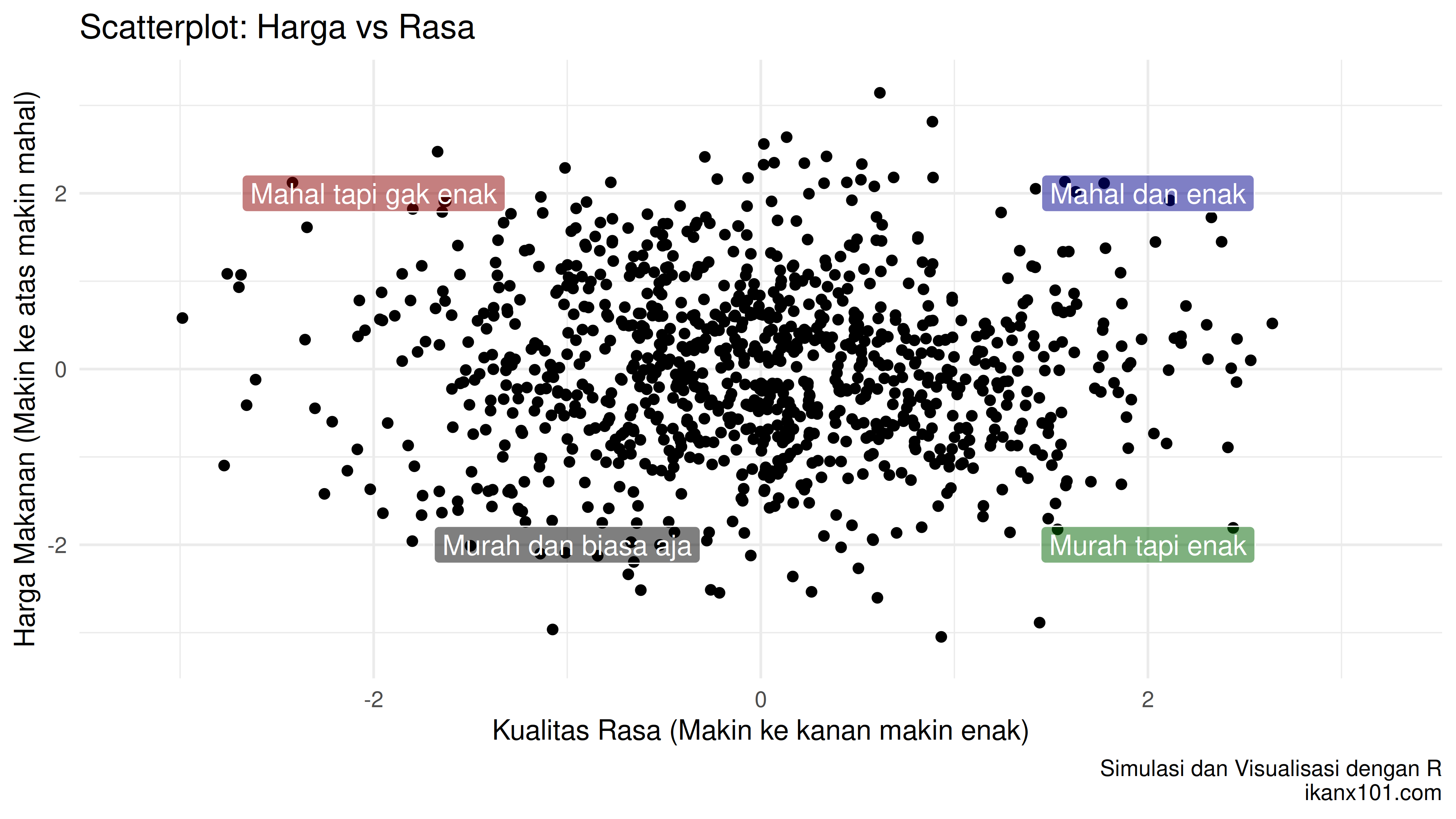 Bayangkan ada ribuan restoran di Jakarta. Secara statistik, rasa dan harga itu harusnya random atau malah seharusnya berkorelasi positif (bahan mahal = rasa lebih enak). Tapi, kita sebagai konsumen hanya akan memesan makanan yang: