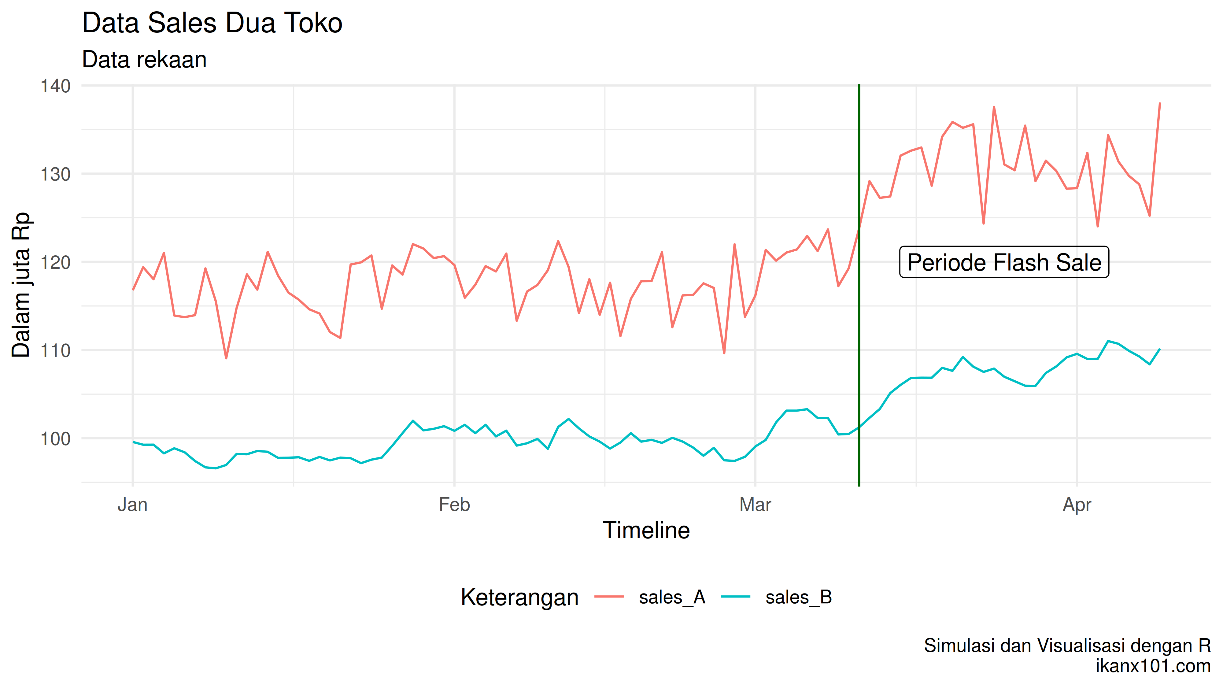 Misalkan saya adalah memiliki dua toko retail di salah satu kota tertentu. Saya memiliki data sales selama 100 hari untuk kedua toko tersebut. Pada hari ke-71 hingga 100, saya melakukan intervensi berupa flash sale pada toko A. Sedangkan pada toko B tidak ada flash sale sama sekali. Saya hendak mengetahui berapa uplift murni yang disebabkan oleh flash sale tersebut.