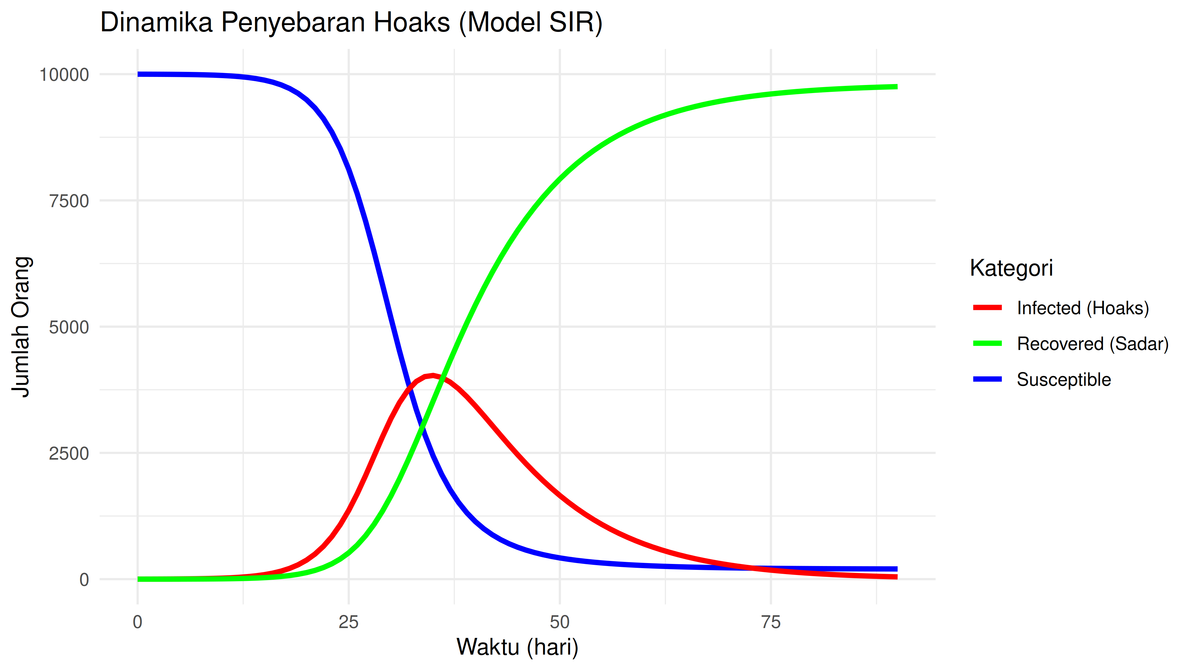 - R (Recovered): Orang yang sudah tahu itu hoaks dan tobat sehingga tidak menyebarkannya ke orang lain (kebal).
