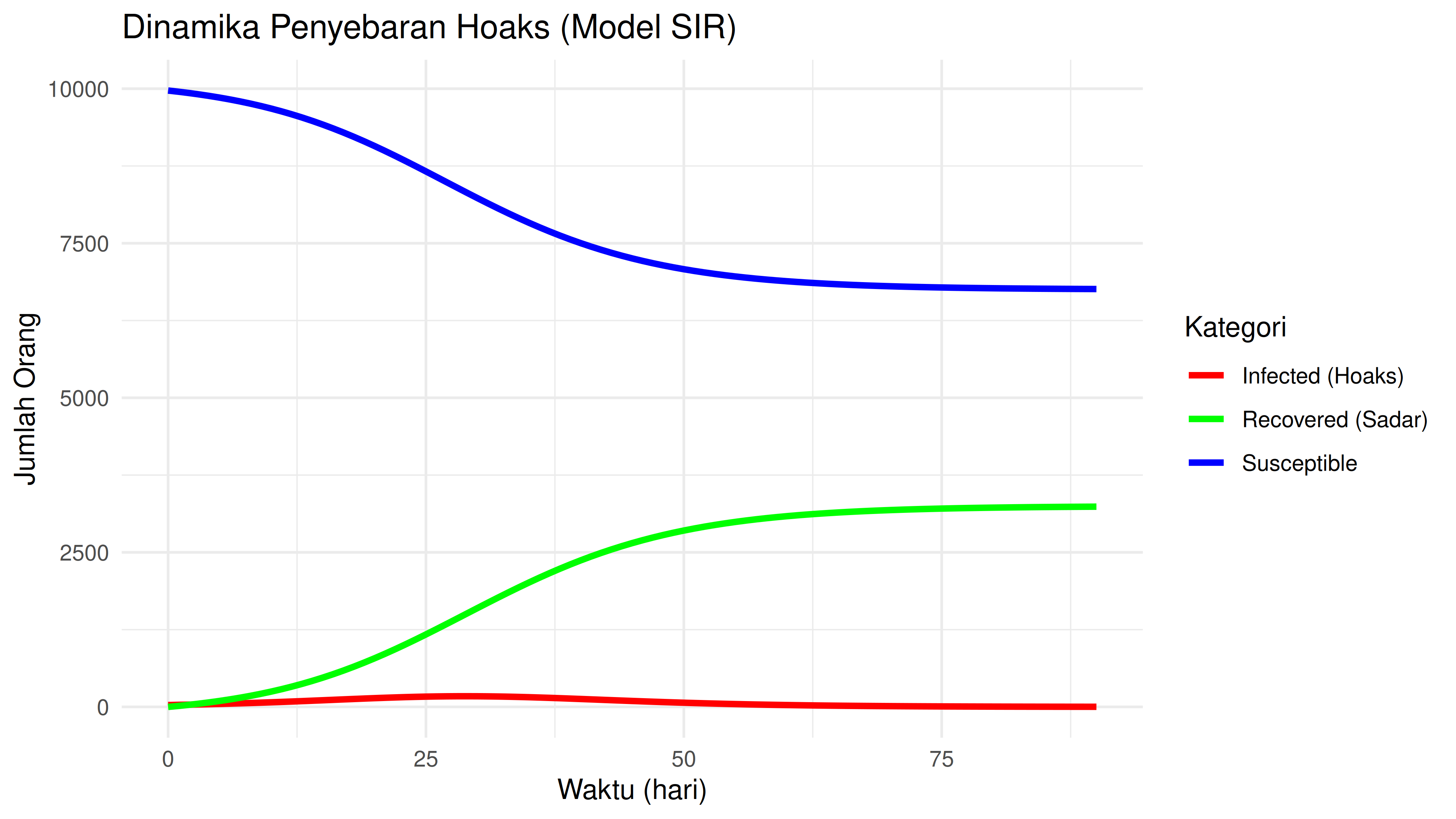 - S (Susceptible): Orang yang belum terpapar hoaks (rentan).