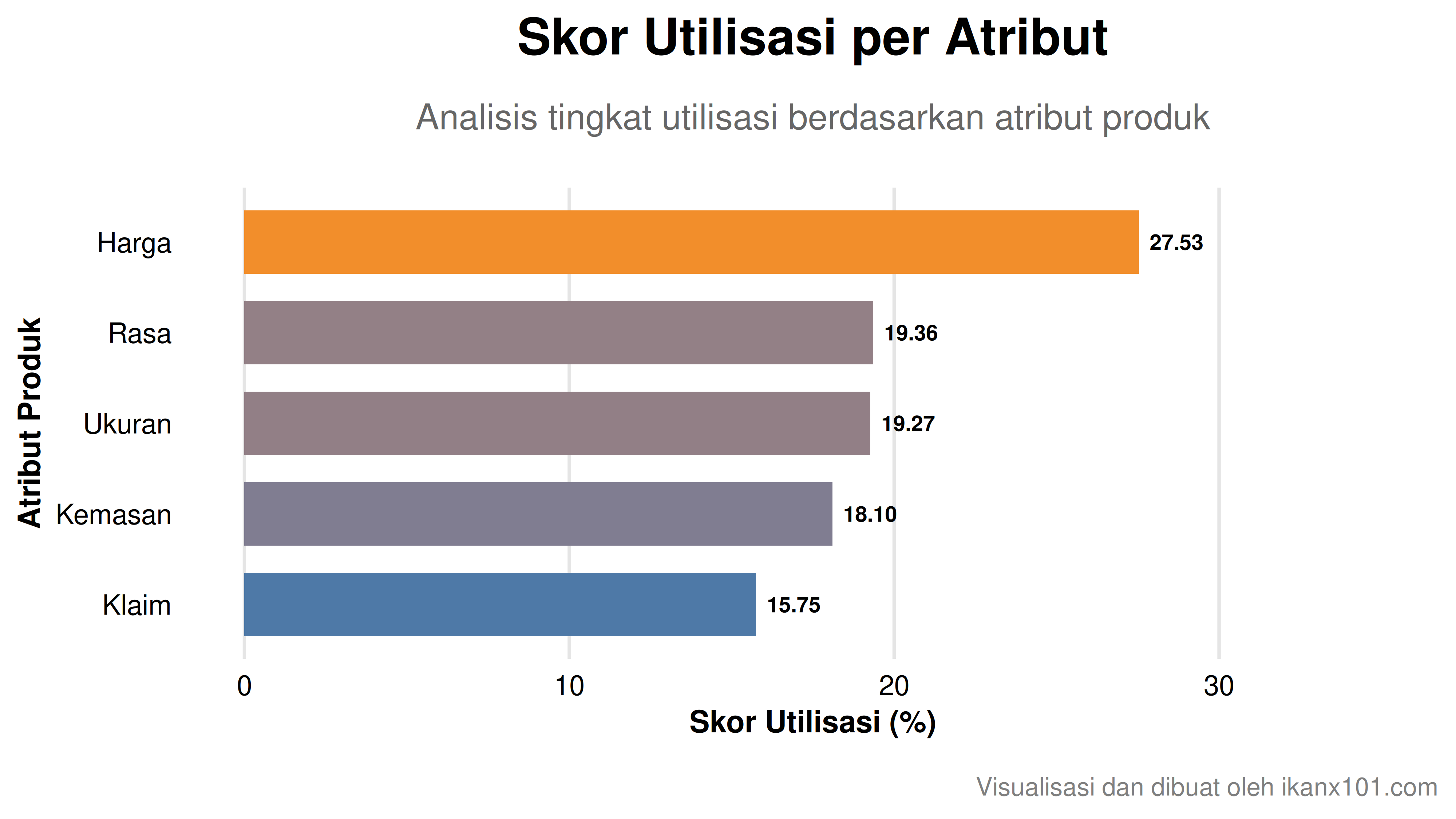 Atribut Harga merupakan faktor paling penting bagi konsumen dengan nilai utilisasi 27.53%. Ini menunjukkan bahwa konsumen sangat sensitif terhadap harga produk teh.