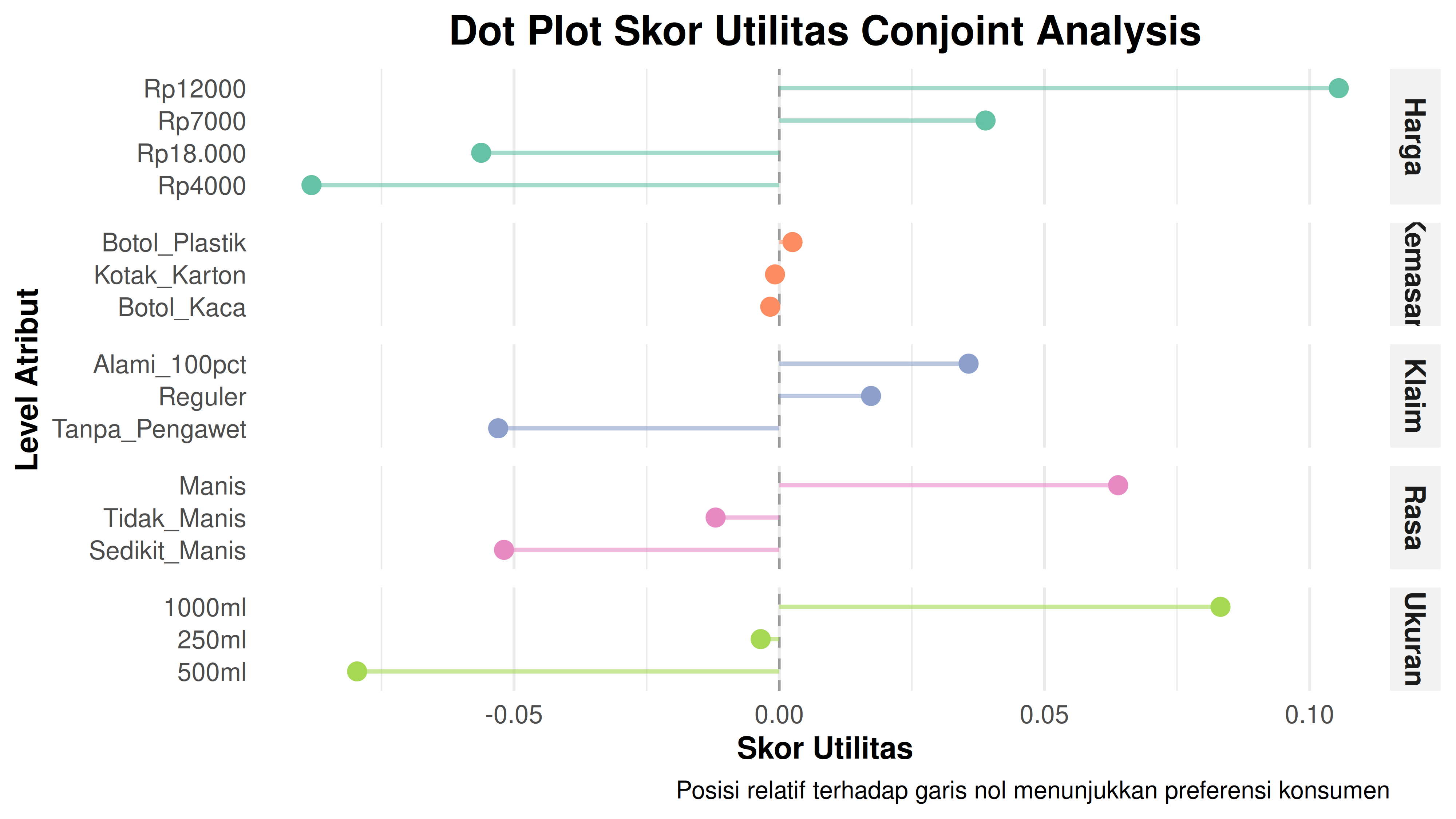- Ukuran 500ml kurang disukai (-0.0796).