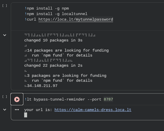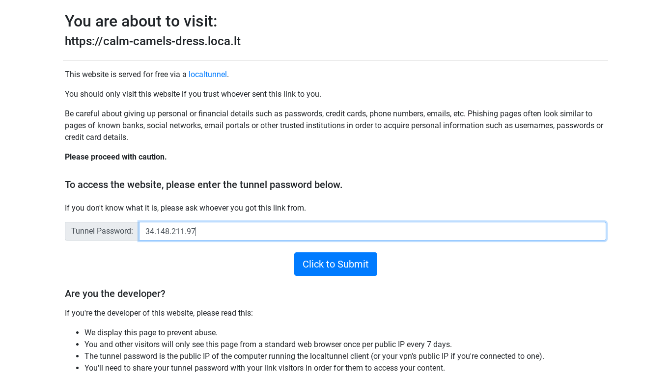 Simpan alamat IP sebagai password layanan localtunnel. Klik link yang diberikan dan masukkan password: