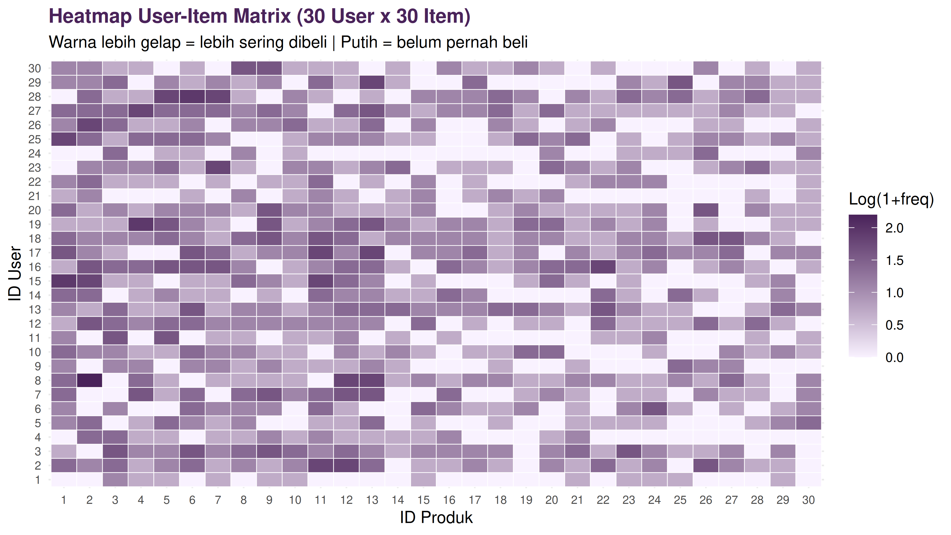 Angka 0 berarti belum pernah beli (atau rating tidak diketahui). Ini disebut sparse matrix karena mayoritas nilainya 0. Pada kondisi real di e-commerce, seorang user mungkin hanya pernah beli 0.1% dari semua produk yang tersedia.
