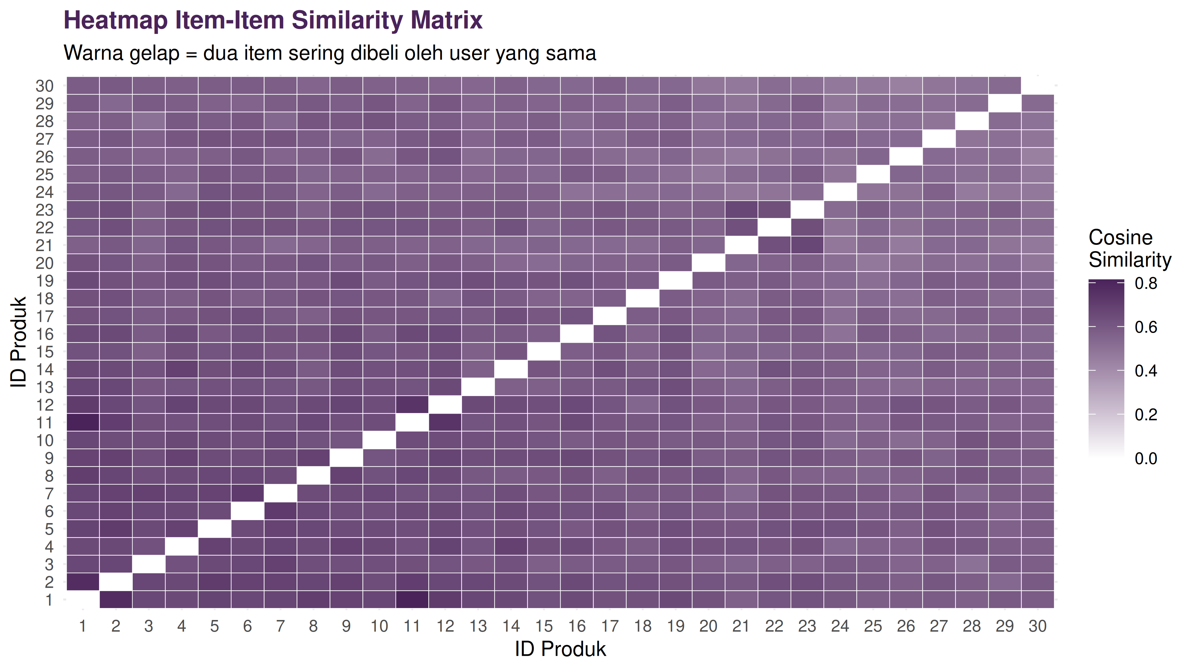 - Scalability. Algoritma di atas menggunakan full matrix multiplication. Kondisi ini bagus untuk ratusan user dan puluhan item. Untuk jutaan user, dibutuhkan approximate nearest neighbor (ANN) atau matrix factorization (SVD, ALS) yang jauh lebih efisien secara komputasi.