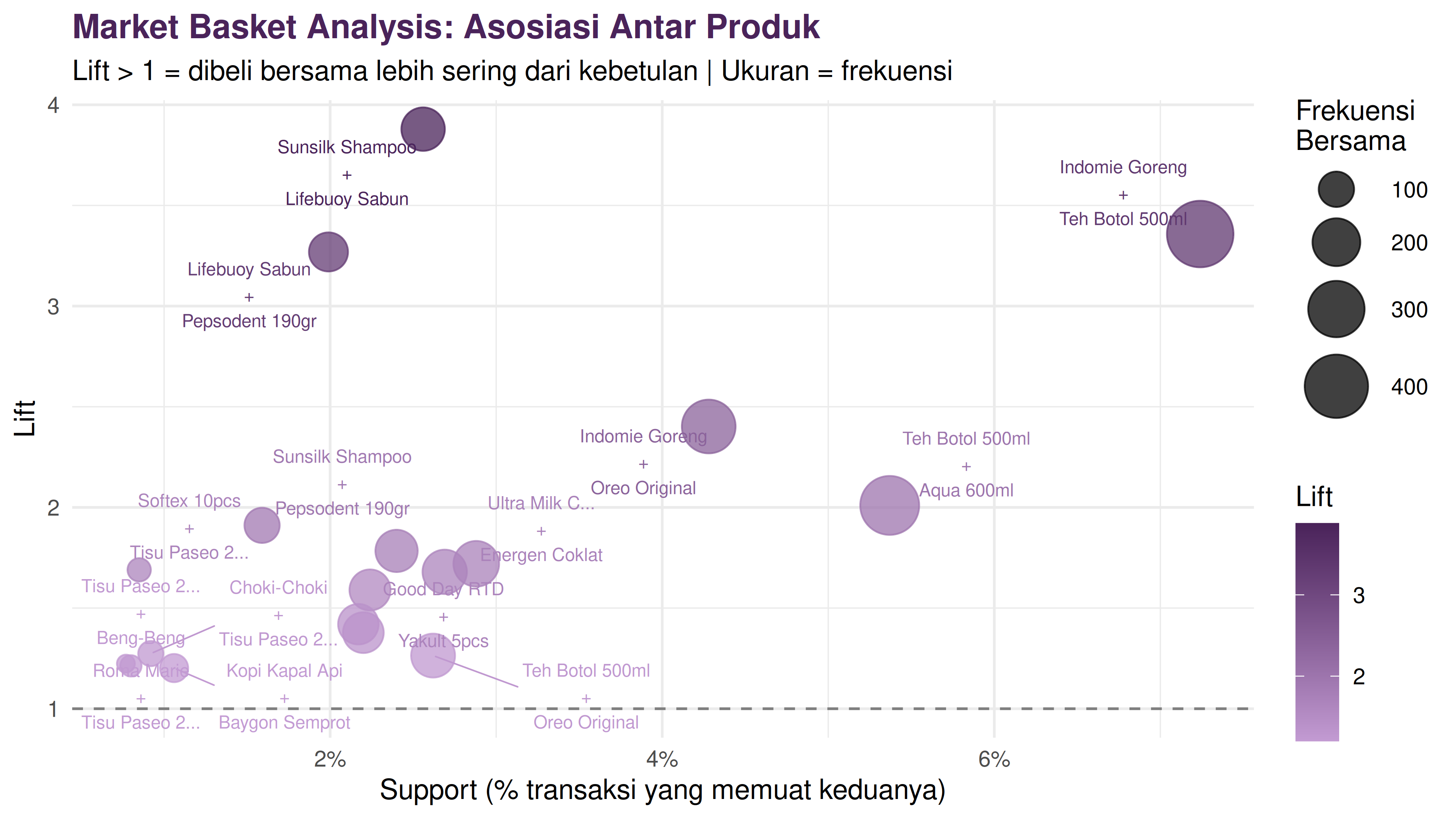 - Planogram dan bundling. Pasang produk dengan lift tinggi berdekatan di rak toko fisik atau halaman kategori. Buat bundle package dari pasangan dengan support dan lift tertinggi.