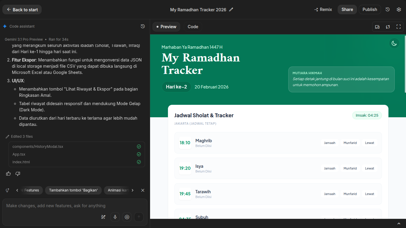 Hasilnya tidak serta-merta saya terima. Saya akan coba prompt lagi agar si AI bisa bekerja dengan lebih baik membangun apps yang saya mau: