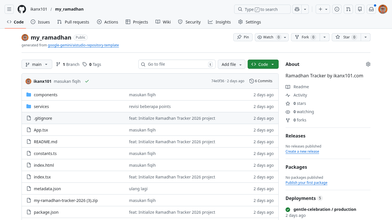Kemudian saya masukkan semua coding yang dihasilkan ke sana. Proses ini sangat mudah, cukup unzip the zipped files, add, commit, dan push. Hasilnya seperti ini: