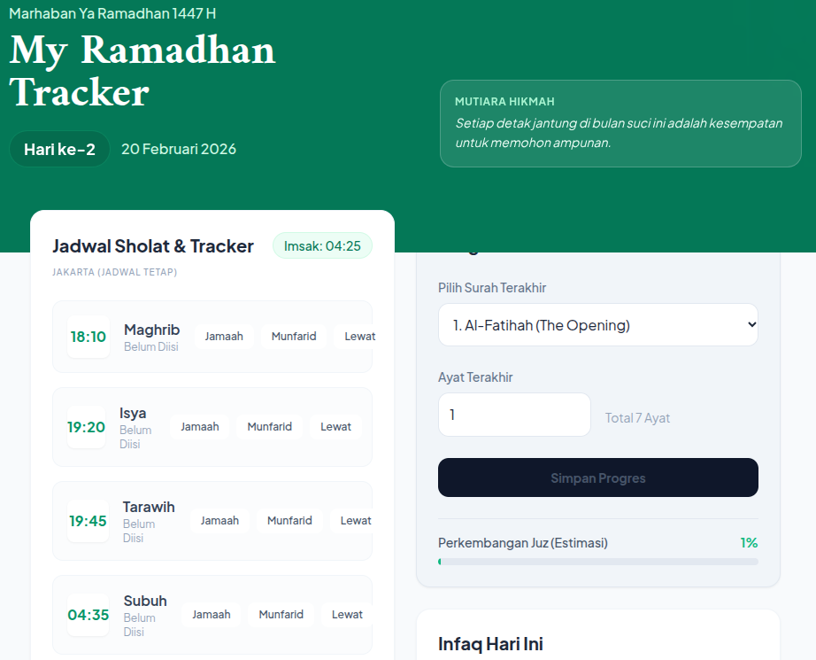 Buat program berjudul "My Ramadhan Tracker" yang berfungsi untuk memberikan jadwal imsakiyah pada bulan Ramadhan di tahun 2026 ini. Aplikasi berisi: